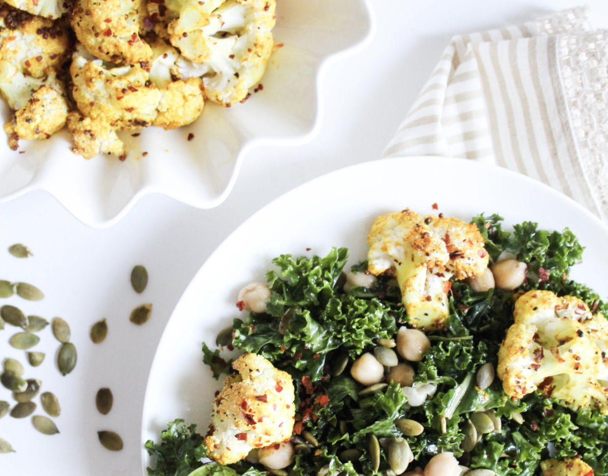 Toss kale with cauliflower, chickpeas, and pumpkin seeds.