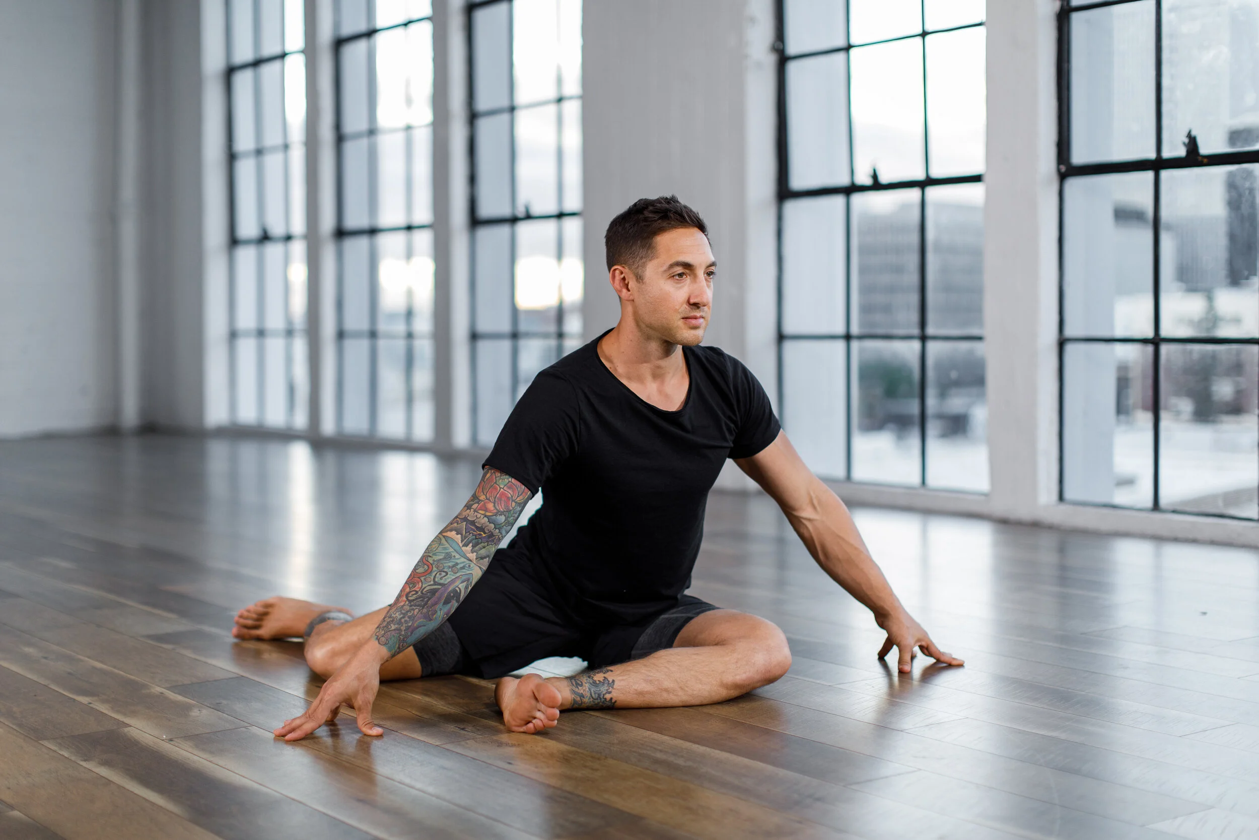 Sit upright with your legs in Butterfly pose, then shift your right leg behind you so your foot is behind your hip. Shift your left leg so your thigh crosses in front of you and your left foot approaches your right knee. Plant your sit bones on the floor. You should be aiming for a right angle with both legs, but there’s no need to push it. Repeat on the other side.