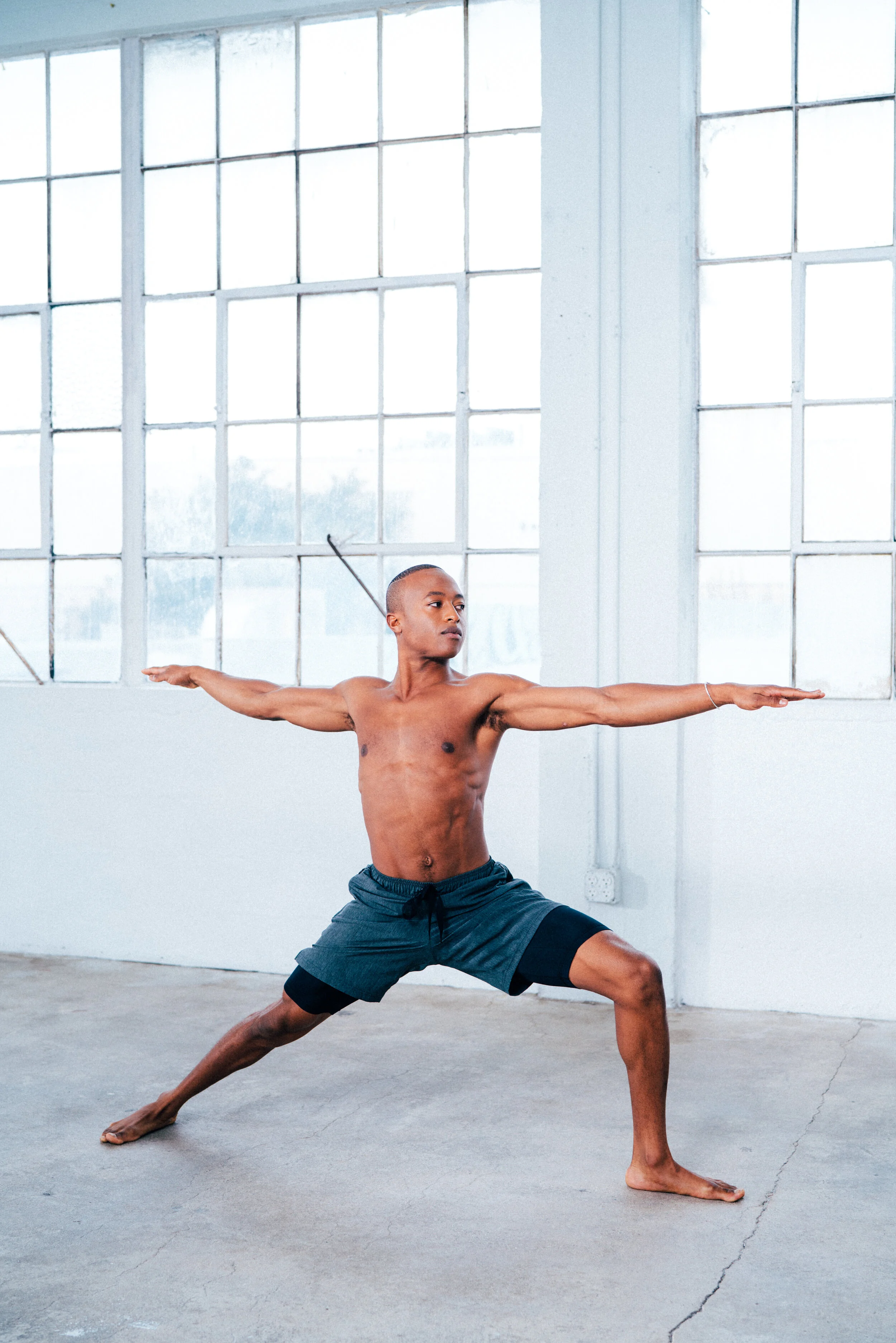 If you want to feel strong, steady, and focused, Warrior II is just the pose to practice. Start in a High Lunge with your right leg forward, then open your hips to face the left and bring your back foot parallel to the back edge of the mat. Sink deeper into your legs while you align your spine vertically and extend your arms out horizontally. Reach out through your fingers and bring your gaze forward. Switch sides.